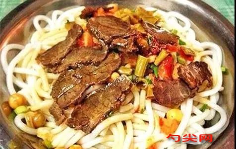 配方:切粉100克,鹵牛肉25克,香菜5克,炸黃豆10克,炒香的辣椒粉3克,骨頭湯100克,鹵水50克。