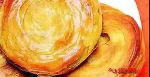 工藝流程:從10斤白面中取出0.3斤,加入適量的油和食鹽,拌成稀酥子備用。取白面1.7斤,加入適量的溫開水,和成面團,作為起面。將起面放置一段時間,讓其稍微發酵。將剩余的8.3斤白面和泡多源B拌勻加入適量的溫開水,和成稍硬的面團。揉勻至面團光滑。將面團滾成細條,撕成25個小塊。每手各拿一塊面,用手推開成薄片,抹上稀酥子。將抹上稀酥子的面片卷起來,用手包成圓形。用刀在圓形面團的周圍旋開,使其形成層次分明的邊緣。按扁搟成圓形餅狀。預熱鏊子至燙手時,將餅坯放在鏊子周圍。當餅坯的皮被燙住后,用刀從中切開,但不要切斷底部。翻轉餅坯,再燙一會兒,使其兩面都受熱均勻。將餅坯面向里放入烤爐中,烤到五成熟時,翻轉再烤一會兒,直至兩面都烤至金黃且熟透。