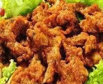 工藝流程:將雞叉骨放入清水中浸泡出血水,然后清理干凈放入盆中。加入味達蕾903號、奧爾良腌料、洋蔥絲、大蒜、生姜片、白糖、雞精、精鹽、耗油、白胡椒粉、十三香和一個雞蛋,抓拌均勻。冷藏腌制2小時。將低筋面粉、早秈米粉、玉米淀粉、面欣酥B干拌均勻。取200克涼水,加入鹽、白糖、五香粉、色拉油,攪拌溶解均勻。將調好的水慢慢倒入混合好的面粉中,打攪均勻,靜止發酵20分鐘。將腌制好的雞叉骨取出,挑揀出大蒜、洋蔥絲、生姜片。加入調好的面糊,攪拌均勻。鍋中油溫提前升至160度,下入雞叉骨。油溫掌握非常關鍵,油溫太高會導致炸膨化了不酥脆。下鍋后先不要翻動,炸至定型后用筷子分開黏的雞叉骨,慢慢翻動以便炸得均勻。炸至色澤紅潤,約7成熟時,撈出。將鍋中的油溫升至180度,把雞叉骨放入油鍋中復炸四五分鐘,炸至外表金黃酥脆即可出鍋。趁熱撒入適量的孜然粉、辣椒粉即可。