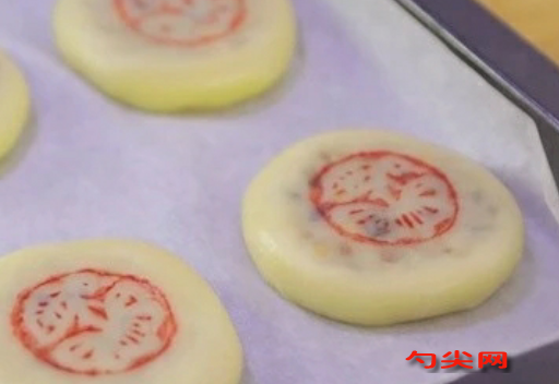 工藝:首先制作百果餡。將各式堅果和水果干都準備好。干果可以選擇配料表所標示的品種,也可以換成其他你喜歡的品種(榛子、花生都可以),種類可以豐富一些,保證總重量不變就行。將堅果和水果干都切碎。盡量均勻切碎,不要殘留太大顆的果仁。準備熟面粉。將中筋面粉在鍋里用中火加熱并不斷翻炒,一直將面粉炒熟。當面粉變得有些發黃以后就炒好了。炒好的熟面粉冷卻后使用。在一個大碗里,倒入制作百果餡的所有配料,將它們混合均勻。拌勻以后,得到的餡看上去有點松散,但實際上用手輕輕一捏即可成團。制作餅皮。首先將水油皮的配料混合揉成面團,揉好以后用力的揉十幾分鐘(有廚師機的同學可以用廚師機來揉面),一直將面團揉透,看上去光滑有彈性(不同面粉吸水性不一樣,請根據實際情況調整水的用量。面團不要太硬,要盡量柔軟一些)。揉好的面團均勻分成12份,然后蓋上保鮮膜或濕布,松弛15分鐘。接著制作油酥面團。將黃油隔水加熱或微波爐加熱熔化成液態,然后和花生油混合。接著加入面粉,充分拌勻,油酥面團就做好了。將油酥面團也分成12份。水油皮面團在手心壓扁,中間放一塊油酥面團,然后包起來。包好以后將面團在案板上搟開成為橢圓形,從一頭卷起來,注意卷緊。把所有的面團都這樣處理好(包好的面團注意蓋上濕布或保鮮膜防止表面變干)。取一個卷好的小面團,在案板上壓扁并再次搟開。搟開后再一次卷起來。同樣把所有面團都做好,并蓋上保鮮膜或濕布松弛15分鐘。把百果餡分成35克一個,揉成圓形備用。取一個卷好的小面團,將面團的兩頭往底部收,使它成為一個圓形面團。收口朝下搟開成圓餅狀。然后將面團翻過來(收口一面朝上),將百果餡放在面團中央。包起來,并將面皮慢慢往上推,直到收口。收口一面朝下放在案板上,壓扁,用搟面杖輕輕搟成圓餅狀。所有面團都處理好以后,放在烤盤上,在餅皮表面用紅色食用色素蓋一個裝飾戳。靜置20分鐘以后再烘烤。烤箱預熱至上下火160℃,將月餅放入烤箱中層,烘烤30分鐘左右,直到餅皮的層次完全舒展開來。月餅在烘烤過程中會層次會慢慢舒展開,注意觀察表面,不要上色過深。這是一款白皮餅,不要用太高的溫度來烘烤,不然表面顏色烤得太深就不好看了。不同的烤箱溫度情況會有不同,請根據實際情況來調整。要保證上色不過深,同時要保證烘烤足夠的時間,讓餅皮層次完全舒展,餡兒烤透變得香酥。