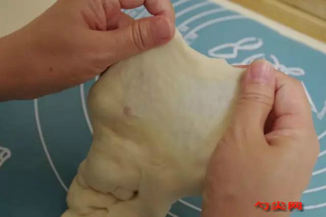 將所有材料揉制成團,盡量揉出筋膜,便于后邊包裹酥油。可以像揉面包團似的摔打來快速增加筋度,揉到如圖產生比較薄的膜時即可,蓋保鮮膜餳30分鐘。