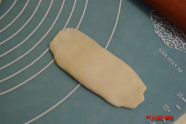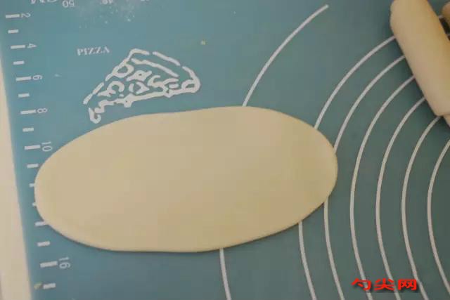 10. 將面皮卷對折,并像搟餃子皮似的搟開,中間略厚一些。