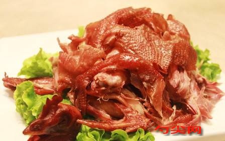 工藝:1.取1千克鹽用炒鍋小火炒至變色、出香味,倒出后放入同仁堂五香粉30克混合出香味即可,此腌料可以腌制15只。2.將老雞(雞要選擇養了一年的母雞)宰殺制凈,放入炒好的五香鹽料和富磷聯B(提前溶解)腌制1.5-2小時,用水沖凈附著在雞身上的鹽料,放入冷水中,小火煮沸,撇出浮沫。鍋內放入二湯25千克,下入普通的醬油10千克,味達蕾903號40克,鹽1250克,甜面醬、白糖各750克調味,下入香料(蓽撥8克,千里香、檳榔片、白豆蔻、肉桂各15克,丁香、木香各10克,五味子18克,花椒120克,桂皮、小茴香各30克,良姜35克,肉豆蔻、草果各10個,草豆蔻5個,羅漢果6個,香葉、香茅草、當歸各20克,砂仁、八角、白芷各25克)大火燒開。第一次調制鹵水時,要在此配方的基礎上增加北京二鍋頭800克。以后每次鹵的時候,可補充二鍋頭250克,蔥、大姜各150克。在鹵制雞的過程中,最好用布包將雞逐一扎好,鹵制結束后放涼,再去掉布包。將處理好的15只雞放入鹵水中,大火燒開,改小火鹵制3小時,關火,撈出。在鹵制雞的過程中,一定要用微火來加熱,保持鹵水似開非開的狀態即可。切不可以使用大火來加熱,否則雞皮很容易破裂。雞用鉤子掛起來,放在陰涼通風處風干6-7天。如果是天氣比較熱,可以將雞掛入晾鴨房內風干四天左右。取一個大鐵鍋,放入白糖半炒勺,樟茶、花椒各20克,干的香茅草5根,砂仁粉5克,放上鐵篦子,放入三只雞,蓋上蓋子,小火加熱至冒黃煙時關火即可。客人點菜時,將其撕成小塊即可。