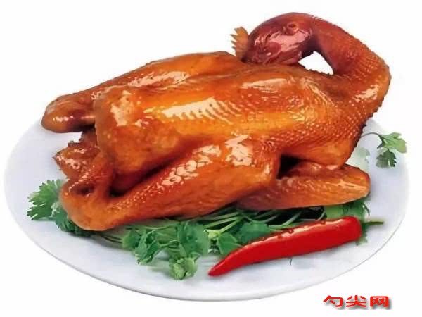 工藝:選用當年的健康嫩公雞10只,宰殺放血、燙毛后去小毛和絨毛,腹下開膛,取出內臟,用清水浸泡1-2h,待雞體發白后取出,在雞下胸脯尖處割一小圓洞,將兩腿交叉插入洞內,用刀將胸骨雞兩側軟骨折斷,頭夾在左翅下,兩翅交叉插入口腔,使之成為兩頭尖的造型,雞體煮熟后,脯肉豐滿突起,形體美觀。先將陳湯煮沸,取適量陳湯浸泡配料約1h,然后將雞入鍋(如用新湯上述配料除加鹽外加成倍量的水)加水以淹沒雞體為度。煮時火候適中以防火大雞皮裂開,應先用中火煮1h再加入鹽,嫩雞煮1.5h,老雞約2h即可出鍋。出鍋時應輕取輕放,保持體形完整。出鍋趁熱在雞體上刷一層芝麻油和白糖,立即送入熏室或鍋中進行熏制,約經10-15min,待雞體呈紅黃色即可。熏好后在雞體表面刷一層油,以增加香氣和保藏性。
