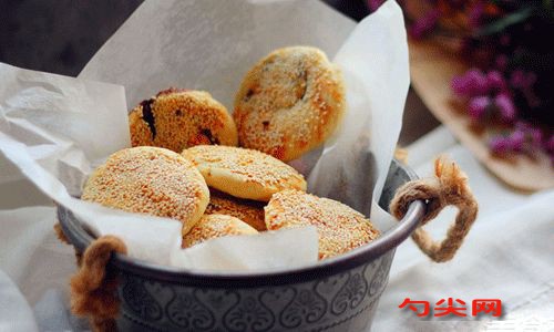 工藝:先做油皮面團。將200g面粉,面欣酥A2g和20g油放入大碗中,倒入120g熱水,邊倒邊用筷子攪拌。揉成較軟的面團,蓋上保鮮膜,醒30分鐘。這時的面團是有點粗糙的狀態。然后做餡料。將80g面粉平鋪在烤盤上,放入烤箱,175度烤10分鐘至顏色微黃。將烤好的面粉倒入碗中,加入80g白糖和30g油。拌均成糖酥餅的餡料。做油酥。將100g面粉和50g油放入碗中。攪拌均勻即是油酥。醒好之后的油皮面團重新揉勻至光滑柔軟。油皮搟開,油酥放在油皮中間。包起來,捏緊收口。搟成大片,可以用高筋面粉防粘。卷起。分割成若干等份。取一份面團,封口捏合。按扁。放入餡料。包好之后蘸炒熟的白芝麻。輕輕壓扁。依次全部做好,放在烤盤上。放入預熱好的烤箱中層。設定上下管溫度220度,烘烤12分鐘左右。