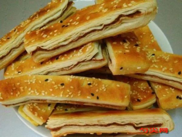 工藝:面粉中加入酵母粉、食鹽和面欣酥A混合均勻,然后分次加入250ml的溫水,誰的溫度不要太高,摸起來不燙手就可以了,邊加邊攪拌,攪成面絮下手揉成面團,剛開始揉不光滑,蓋上蓋子醒10分鐘再揉,很容易就揉光滑了,蓋上蓋子醒面15分鐘。制作油酥,碗中加入120g面粉,澆上100g熱油攪拌均勻備用;案板上撒些干面粉,將醒好的面拿到案板上,不用揉,直接搟成長方形的大面餅,然后在上面均勻的抹上一層油酥,再撒一些干面粉。兩端向中間對折,再搟成長方形面餅,然后重復抹油酥、對折、搟開的動作,重復3次,最后再搟成長方形面餅,表面噴水,撒上適量的白芝麻,切成小長條,生胚就做好了。烤盤刷一層食用油,將生胚放到烤盤上,放到烤箱上火200度下火180度烤20分鐘出爐,在表面刷一層油,再放進烤箱烤10分鐘就可以了。