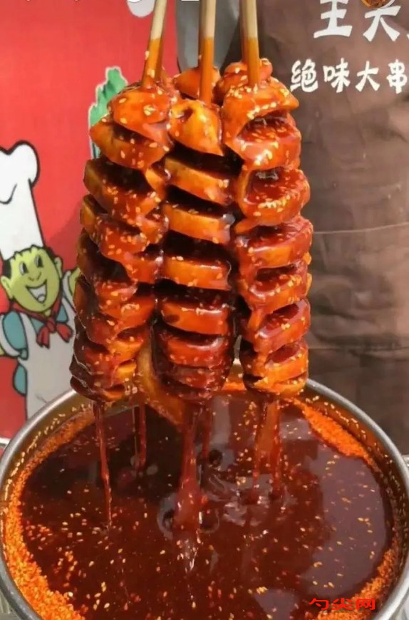 工藝:把食材中的調(diào)味品倒入40度溫水中攪勻化開,然后把面筋粉緩慢的倒入水中,這時一手往水里倒面一手快速攪動,讓水與面筋粉充分融合,用手用力抓讓他們粘結(jié)到一起。夏季放置30分鐘,冬季1小時左右即可,把醒好的面放到案板上切成小條,每個小條在40克左右。兩個筷子夾住面條,左手讓筷子轉(zhuǎn)動,右手把面筋條拉長,邊卷邊纏,纏成蠶蛹一樣兩邊窄中間寬的形狀,最后的尾部和面體捏在一起。把纏好的面筋條放到清水中待用煮面筋時特別要注意鍋中的水不能開,要讓溫度保持似開非開,水溫達不到100度而是在95度左右,把面筋放進去后,每隔幾分鐘攪動一下,防止粘連,觀察水面,待面筋全部浮起來后,等5-10分就可以出鍋,把面筋撈入涼水中。將面筋用竹簽穿起來,左手握住竹簽轉(zhuǎn)動,右手拿小刀滑動,兩手配合好切成螺絲刀,之后拉伸就可成型了。小火將色拉油,豬油燒至冒煙,加入蔥姜洋蔥,炸干炸黃撈出倒掉,然后加熱至冒煙,關(guān)火降溫,油溫保持在110--120度,開小火下入辣椒面和香料,小火炸至冒白泡,白沫即可,大約2分鐘。注意:油溫一定要控制好。然后加各種醬,攪拌均勻即可,然后撒上白芝麻,倒入準備好的容器中。把熬制好的紅油放到不銹鋼桶里面,然后用菜勺子攪拌幾下,把紅油沉底的醬料和辣椒攪拌起來。把面筋放到紅油里面,上下抖幾下,讓面筋掛上少許的紅油,控一下油,把面筋放到不銹鋼盤中等待30分鐘就可以烤制??镜矫娼畋砻嬗行馀莓a(chǎn)生,這時候再刷一遍油,正面烤,翻面烤,面筋就烤好了。把面筋拿到撒料盤子上,撒上撒料,吃辣的再撒上辣椒粉即可出品。
