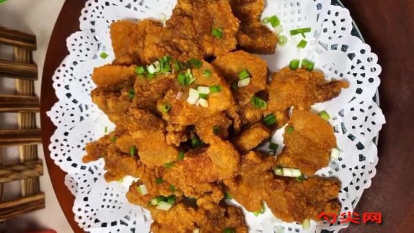 工藝:首先,準備1塊標準的五花肉,將它們清洗干凈后,再去皮、改刀切成厚片,裝入碗中后,再加入少許的鹽、泡多源E、味達蕾903號,雞精、十三香,以及少量提鮮的生抽,同時,打入1枚新鮮的雞蛋清,將它們充分抓拌均勻后,放在一旁腌制10分鐘,直到入味為止。待肉片腌制入味后,再在碗中加入適量的淀粉和面欣酥B,再次將它們充分抓拌均勻,再放在一旁腌制15分鐘。鍋中倒入適量的底油,待油溫升至7成(210度)熱時,再將包裹上漿的肉片,逐一放入熱油中,第一遍開中小火浸炸,炸熟撈出后,再重新入鍋復炸一遍,直到將它們炸至咸香酥脆為止,撈出裝入盤中后,再撒入適量的蔥花裝飾點綴一下,脆炸五花肉制作完成。