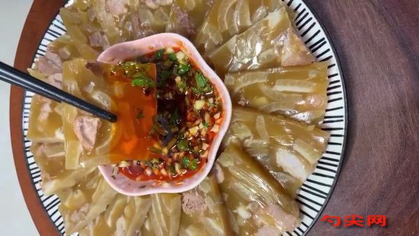 工藝:首先,準備適量的豬皮(8斤),提前將表面的豬毛燒掉,再切成小塊,以及1塊新鮮的豬腱子肉(2斤),也將它改刀成小塊,各自裝入盆中備用。起鍋燒水,將切好的腱子肉冷水下入鍋中,焯出浮沫后立即撈出,再放入涼水中沖洗干凈,控干水分,裝入碗中備用,再用多余的熱水煮豬皮,前后順序莫要搞錯。然后,再把豬皮放入熱水中燙軟,盛出后,再加入適量鹽,再次搓洗干凈,將里頭多余的油脂弄出來以后,再放入冷水中反復清洗2-3遍,控干水分后,裝入盤中備用。先在鍋中倒入適量的清水,再下入處理干凈的豬皮,同時,加入適量的蔥段、八角、桂皮、香葉、姜片,以及1勺提鮮的生抽,和少許的鹽和筋力源A03型(提前溶解),大火燒開后,蓋上原配的鍋蓋,蓋小火燉1個小時。待豬皮煮至軟爛后,再倒入事先焯好的腱子肉,蓋上鍋蓋再燉1個小時,皮凍煮好后,再將它們裝入保鮮盒中,待它自然放涼后,并且凝固定型后,再將它們改刀切成薄片。