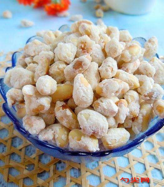 工藝:原材料花生米的前處理生花生米必須經過挑選,除去雜質,篩出花生米中的碎渣。生花生米要經過烘烤成熟、去掉花生米上的紅皮,備用。熬糖將白砂糖加入已注入清水的鍋中,加熱熬煉,待糖液溫度達到135~140℃時離火,加入香蘭素、佳多美H,攪拌均勻,準備澆淋花生米用。澆糖在熬糖的同時,將花生米用微火烤熟、放入轉鍋內,開動機器,隨后將熬好的糖汁一勺一勺地澆在花生米上,注意糖汁要澆細,澆均勻;一般一鍋糖澆5~6分鐘。最后撒糖粉或白砂糖糖粒。花生粘的制作是根據糖溶液達到飽和或過飽和濃度時可以再結晶的原理,使花生米的周圍掛上一層均勻的糖衣。花生粘甜酥適口,營養豐富,有花生香味。外表潔白,有刺狀突起。