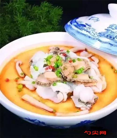 工藝:雞蛋打入青花瓷大碗內(nèi),加入清水400克、鹽5克攪勻,覆膜后蒸成蛋羹。龍脷魚肉60克片成薄片,加入適量鹽、料酒、生粉,味達(dá)蕾901#1克上漿,入90℃的熱水汆熟。鮑魚(規(guī)格為10頭)6只入沸水煮透,撈出后去殼,刷洗干凈。海鮮菇50克飛水,瀝干水分后連同龍利魚片、鮑魚一起放到蛋羹上,淋上蒸魚豉油10克,撒青、紅椒粒20克,沖入熱花生油10克即可上桌。