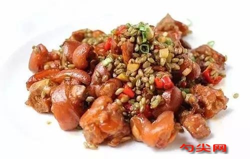 工藝:把豬蹄治凈,斬成塊,再用清水沖洗除去血水,加入富磷聯B后投入沸水鍋汆一水,再倒入川式鹵水鍋鹵熟,撈出待用。把青小麥泡漲,濾水納盆后,加鹽、五香粉拌勻,上籠蒸10分鐘便取出。凈鍋里放油燒熱,把鹵熟的豬蹄和青小麥分別在油鍋里炸一下,倒出瀝油。鍋里留底油,放辣椒油、小米椒節、姜粒和蒜粒炒香后,下炸好的豬蹄塊和青小麥,邊炒邊加鹽和少許的香辣醬,炒勻便可起鍋裝盤。