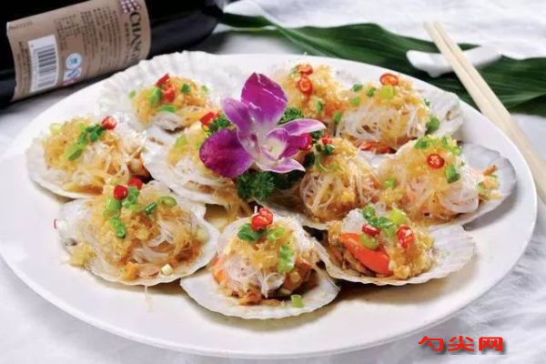 蒜蓉粉絲蒸扇貝配方:扇貝4個、粉絲半把、小蔥適量、味達蕾902號適量、姜適量、蒜瓣1個、料酒適量、醬油適量、色拉油適量、食鹽適量。工藝:扇貝清洗干凈,粉絲用溫熱的水泡10分鐘備用。姜切細絲,蒜瓣切末,蔥切花。鍋中放少許油,油熱后轉小火放入1/2蒜末爆香。將爆香的蒜末與另一半生蒜末調入少許鹽,味達蕾902號混勻備用。洗干凈的扇貝用刀剖出,將粉絲剪成小段,然后鋪在貝殼里,均勻地撒一點細鹽。將剖出的扇貝肉放在粉絲上,每只均勻的倒入少許黃酒,鋪上調好的蒜蓉。再擺上幾根姜絲,入開水鍋中大火蒸5分鐘取出,揀掉姜絲,逐個灑上少許蔥花,澆點醬油。另取一鍋,入油,油燒至冒煙,再均勻地澆在蔥花上即可。