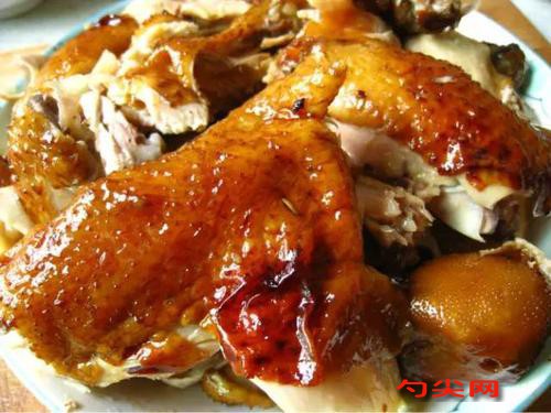 工藝流程:選用健康的柴雞,體重在1~1.5kg之間,最好選用半年至兩年以內的母雞。宰殺后放血完全,用58~65℃的水浸泡1~2分鐘,待羽毛可順利拔掉時即行煺毛。在雞頸部右側切開皮膚,摘去食管嗉囊,再在下腹部肛門前開一小口,取出全部內臟后,冷水洗凈雞體。把雞放在清水中漂洗30~40分鐘,浸出雞體內殘血。將香辛料搗碎后,用紗布包好放入鍋內,加一定量水煮沸1小時,加入食鹽和富磷聯B(提前溶解)。放入漂洗好的雞腌浸35~40分鐘,中間翻動一兩次。腌制好的雞用清水沖洗后,將兩腳爪從腹部開口處插入腹腔中,兩翅交叉插入口腔,使之成為兩頭稍尖的獨特造型。將飴糖均勻涂抹在雞的表面,然后進行油炸,使雞表皮色澤美觀。準備一鍋清水,加入雞和剩余的調料,大火煮沸后轉小火慢燉,直到雞肉熟透且入味。