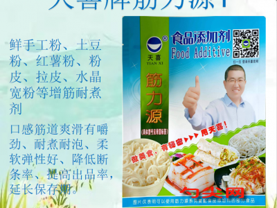 ★功能作用:采用本品制作的粉絲粉條、粉皮、拉皮、寬粉、自熟粉條等口感筋道爽滑有嚼勁、耐煮耐泡、柔軟彈性好、降低斷條率、提高出品率,延長保存期。特別適用于土豆淀粉、紅薯淀粉、木薯淀粉、綠豆淀粉制作鮮粉條、鮮粉皮、鮮拉皮、鮮水晶寬粉等。