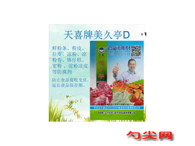 ★商品名:天喜牌美久亭D 產品名稱:美久亭牌復配防腐劑4 型號:MJT-D 本品按照《食品安全國家標準 食品添加劑使用標準GB2760》及補充規定的品種、應用分類、使用范圍、最大使用量、殘留量等科學組方,并且按照《食品安全國家標準 復配食品添加劑通則GB26687》精心配制而成。本品已經通過食品生產許可,保障食品安全。用戶按照本說明的用法用量生產制作的腌漬的蔬菜(食品分類號:04. 02. 02. 03)、淀粉制品 (食品分類號:06.05.02)既不會超標也不會超量。