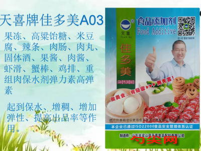 ★商品名:天喜牌佳多美A03型 產品名稱:佳多美牌復配增稠劑3 型號:JDM-A03 本品按照《食品安全國家標準 食品添加劑使用標準GB2760》及補充規定的品種、應用分類、使用范圍、最大使用量、殘留量等科學組方,并且按照《食品安全國家標準 復配食品添加劑通則GB26687》精心配制而成。本品已經通過食品生產許可,保障食品安全。用戶按照本說明的用法用量生產制作的各類食品(配料表中成分在GB2760表A.1中有限量要求的食品除外;配料表中成分在GB2760表A.3中所例外的食品除外)既不會超標也不會超量。