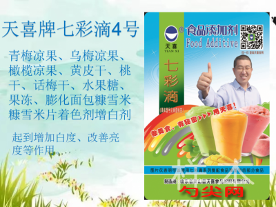 ★商品名:天喜牌七彩滴4型 產(chǎn)品名稱:七彩滴牌復(fù)配穩(wěn)定著色劑4 型號(hào):QCD-4 本品按照《食品安全國(guó)家標(biāo)準(zhǔn) 食品添加劑使用標(biāo)準(zhǔn)GB2760》及補(bǔ)充規(guī)定的品種、應(yīng)用分類、使用范圍、最大使用量、殘留量等科學(xué)組方,并且按照《食品安全國(guó)家標(biāo)準(zhǔn) 復(fù)配食品添加劑通則GB26687》精心配制而成。本品已經(jīng)通過食品生產(chǎn)許可,保障食品安全。用戶按照本說明的用法用量生產(chǎn)制作的涼果類(食品分類號(hào):04.01.02.08.02)、話化類(食品分類號(hào):04.01.02.08.04)、熟制堅(jiān)果與籽類(僅限油炸堅(jiān)果與籽類)(食品分類號(hào):04.05.02.01)、除膠基糖果以外的其他糖果(食品分類號(hào):05.02.02)、果凍(食品分類號(hào):16.01)、膨化食品(食品分類號(hào):16.06)既不會(huì)超標(biāo)也不會(huì)超量。