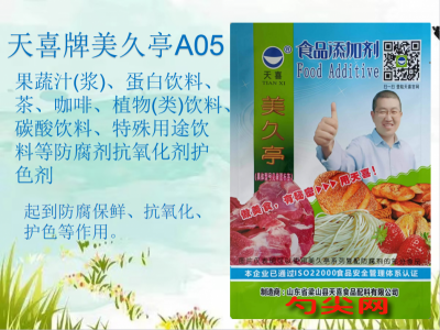 ★商品名:天喜牌美久亭A05型 產品名稱:美久亭牌復配防腐劑20 型號:MJT-A05 本品按照《食品安全國家標準 食品添加劑使用標準GB2760》及補充規定的品種、應用分類、使用范圍、最大使用量、殘留量等科學組方,并且按照《食品安全國家標準 復配食品添加劑通則GB26687》精心配制而成。本品已經通過食品生產許可,保障食品安全。用戶按照本說明的用法用量生產制作的濃縮果蔬汁(漿)(僅限食品工業用)(食品分類號:14.02.02)、果蔬汁(漿)類飲料(食品分類號:14.02.03)、蛋白飲料(食品分類號:14.03)、碳酸飲料(食品分類號:14.04)、茶、咖啡、植物(類)飲料(食品分類號:14.05)、特殊用途飲料(食品分類號:14.07)、風味飲料(食品分類號:14.08)既不會超標也不會超量。