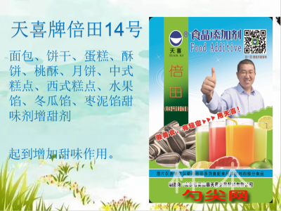 ★商品名:天喜牌倍田14型 產品名稱:倍田牌復配甜味劑14 型號:BT-14 本品按照《食品安全國家標準 食品添加劑使用標準GB2760》及補充規定的品種、應用分類、使用范圍、最大使用量、殘留量等科學組方,并且按照《食品安全國家標準 復配食品添加劑通則GB26687》精心配制而成。本品已經通過食品生產許可,保障食品安全。用戶按照本說明的用法用量生產制作的面包(食品分類號:07.01)、糕點(食品分類號:07.02)、餅干(食品分類號:07.03)、焙烤食品餡料及表面用掛漿(僅限焙烤食品餡料)(食品分類號:07.04)既不會超標也不會超量。