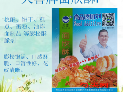 ★商品名:天喜牌面欣酥F型 產品名稱:面欣酥牌復配焙烤食品酶制膨松劑 型號:MXS-F 本品完全按照《食品安全國家標準 食品添加劑使用標準GB2760》及補充規定的品種、應用分類、使用范圍、最大使用量、殘留量等科學組方,并且按照《食品安全國家標準 復配食品添加劑通則GB26687》精心配制而成。本品已經通過食品生產許可,保障食品安全。用戶按照本說明的用法用量生產制作的裹粉、面糊、煎炸粉(食品分類號:06.03.02.04)、油炸面制品(食品分類號:06.03.02.05)、焙烤食品(食品分類號:07.0)既不會超標也不會超量。