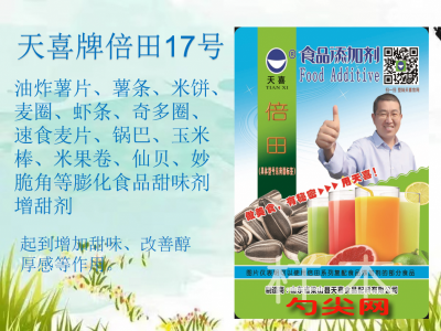 ★商品名:天喜牌倍田17型 產(chǎn)品名稱:倍田牌復(fù)配甜味劑17 型號(hào):BT-17 本品按照《食品安全國家標(biāo)準(zhǔn) 食品添加劑使用標(biāo)準(zhǔn)GB2760》及補(bǔ)充規(guī)定的品種、應(yīng)用分類、使用范圍、最大使用量、殘留量等科學(xué)組方,并且按照《食品安全國家標(biāo)準(zhǔn) 復(fù)配食品添加劑通則GB26687》精心配制而成。本品已經(jīng)通過食品生產(chǎn)許可,保障食品安全。用戶按照本說明的用法用量生產(chǎn)制作的膨化食品(食品分類號(hào):16.06)既不會(huì)超標(biāo)也不會(huì)超量。
