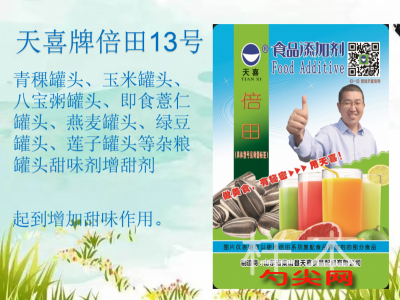 ★商品名:天喜牌倍田13型 產(chǎn)品名稱:倍田牌復(fù)配甜味劑13 型號(hào):BT-13 本品按照《食品安全國(guó)家標(biāo)準(zhǔn) 食品添加劑使用標(biāo)準(zhǔn)GB2760》及補(bǔ)充規(guī)定的品種、應(yīng)用分類、使用范圍、最大使用量、殘留量等科學(xué)組方,并且按照《食品安全國(guó)家標(biāo)準(zhǔn) 復(fù)配食品添加劑通則GB26687》精心配制而成。本品已經(jīng)通過(guò)食品生產(chǎn)許可,保障食品安全。用戶按照本說(shuō)明的用法用量生產(chǎn)制作的雜糧罐頭(食品分類號(hào):06.04.02.01)既不會(huì)超標(biāo)也不會(huì)超量。
