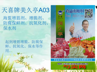 ★商品名:天喜牌美久亭A03型 產品名稱:美久亭牌復配穩定防腐劑 型號:MJT-A03 本品按照《食品安全國家標準 食品添加劑使用標準GB2760》及補充規定的品種、應用分類、使用范圍、最大使用量、殘留量等科學組方,并且按照《食品安全國家標準 復配食品添加劑通則GB26687》精心配制而成。本品已經通過食品生產許可,保障食品安全。用戶按照本說明的用法用量生產制作的腌制水產品(僅限海蜇) (09.03.02)既不會超標也不會超量。