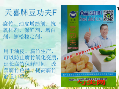 ★商品名:天喜牌豆功夫F型  產品名稱:豆功夫牌復配抗氧化膨松劑4 型號:DGF-F  本品按照《食品安全國家標準 食品添加劑使用標準GB2760》及補充規定的品種、應用分類、使用范圍、最大使用量、殘留量等科學組方,并且按照《食品安全國家標準 復配食品添加劑通則GB26687》精心配制而成。本品已經通過食品生產許可,保障食品安全。用戶按照本說明的用法用量生產制作的腐竹類(食品分類號:04.04.01.04)既不會超標也不會超量。