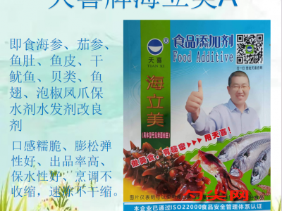 ★溫馨提示:1.本品達不到火堿(氫氧化鈉)的水發效果,如果購買使用海立美的目的就是為了使海參增重或增大,請不要選購海立美。2.本品不具有防腐保鮮作用,即食海參等熟制水產品防腐保鮮可以添加0.2%美久亭G。3.冷凍水產品后油炸的可以使用海立美Q型或海立美F型。4.水產品罐頭可以使用海立美G型。