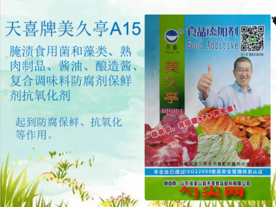 ★商品名:天喜牌美久亭A15型 產(chǎn)品名稱:美久亭牌復(fù)配防腐劑16 型號:MJT-A15本品按照《食品安全國家標(biāo)準(zhǔn) 食品添加劑使用標(biāo)準(zhǔn)GB2760》及補充規(guī)定的品種、應(yīng)用分類、使用范圍、最大使用量、殘留量等科學(xué)組方,并且按照《食品安全國家標(biāo)準(zhǔn) 復(fù)配食品添加劑通則GB26687》精心配制而成。本品已經(jīng)通過食品生產(chǎn)許可,保障食品安全。用戶按照本說明的用法用量生產(chǎn)制作的腌漬的食用菌和藻類(食品分類號:04.03.02.03)、熟肉制品(食品分類號:08.03)、醬油(食品分類號:12.04)、釀造醬(食品分類號:12.05)、復(fù)合調(diào)味料(食品分類號:12.10)既不會超標(biāo)也不會超量。