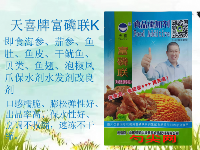★功能作用:采用〔富磷聯K型〕加工制作的即食海參、茄參、魚肚、魚皮、水發干魷魚、水發干貝類、水發干魚翅、泡椒鳳爪等冷凍水產品、熟制水產品、預制肉制品、熟肉制品口感糯脆、膨松彈性好、出品率高、保水性好、烹調不收縮,速凍不干縮。油炸魚類制品膨松飽滿。發制水產品,〔富磷聯K型〕替代火堿使用,安全合法!