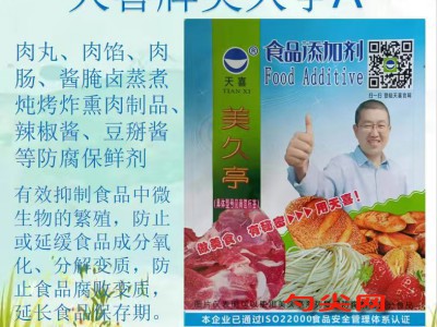 ★商品名:天喜牌美久亭A 產品名稱:美久亭牌復配防腐劑1 型號:MJT-A 本品按照《食品安全國家標準 食品添加劑使用標準GB2760》及補充規定的品種、應用分類、使用范圍、最大使用量、殘留量等科學組方,并且按照《食品安全國家標準 復配食品添加劑通則GB26687》精心配制而成。本品已經通過食品生產許可,保障食品安全。用戶按照本說明的用法用量生產制作的預制肉制品(食品分類號:08.02)、熟肉制品(食品分類號:08.03)、復合調味料(食品分類號:12.10)既不會超標也不會超量。