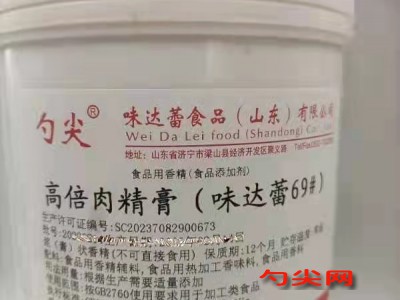 ★商品名:味達蕾69# 產品名稱:高倍肉精膏香精 本品按照《食品安全國家標準 食品添加劑使用標準GB2760》及補充規定的品種、應用分類、使用范圍、最大使用量、殘留量等科學組方,并且按照《食品安全國家標準 食品用香精GB30616-2014》精心配制而成。本品已經通過食品生產許可,保障食品安全。