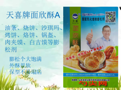 ★天喜牌面欣酥A型 產品名稱:面欣酥牌復配乳化增稠膨松劑 型號:MXS-A 本品按照《食品安全國家標準 食品添加劑使用標準GB2760》及補充規定的品種、應用分類、使用范圍、最大使用量、殘留量等科學組方,并且按照《食品安全國家標準 復配食品添加劑通則GB26687》精心配制而成。本品已經通過食品生產許可,保障食品安全。用戶按照本說明的用法用量生產制作的裹粉、面糊、煎炸粉(食品分類號:06.03.02.04)、油炸面制品(食品分類號:06.03.02.05)、焙烤食品(食品分類號:07.0)既不會超標也不會超量。