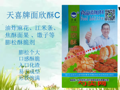 ★商品名:天喜牌面欣酥C型 產品名稱:面欣酥牌復配酸度調節膨松劑4 型號:MXS-C 本品完全按照《食品安全國家標準 食品添加劑使用標準GB2760》及補充規定的品種、應用分類、使用范圍、最大使用量、殘留量等科學組方,并且按照《食品安全國家標準 復配食品添加劑通則GB26687》精心配制而成。本品已經通過食品生產許可,保障食品安全。用戶按照本說明的用法用量生產制作的裹粉、面糊、煎炸粉(食品分類號:06.03.02.04)、油炸面制品(食品分類號:06.03.02.05)、焙烤食品(食品分類號:07.0)既不會超標也不會超量。