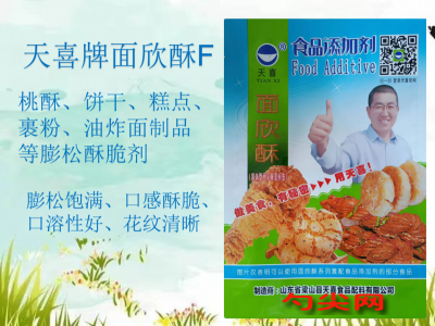 ★商品名:天喜牌面欣酥F型 產品名稱:面欣酥牌復配焙烤食品酶制膨松劑 型號:MXS-F 本品完全按照《食品安全國家標準 食品添加劑使用標準GB2760》及補充規定的品種、應用分類、使用范圍、最大使用量、殘留量等科學組方,并且按照《食品安全國家標準 復配食品添加劑通則GB26687》精心配制而成。本品已經通過食品生產許可,保障食品安全。用戶按照本說明的用法用量生產制作的裹粉、面糊、煎炸粉(食品分類號:06.03.02.04)、油炸面制品(食品分類號:06.03.02.05)、焙烤食品(食品分類號:07.0)既不會超標也不會超量。