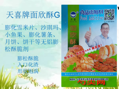 ★配料表:碳酸氫鈉、碳酸氫銨、焦磷酸二氫二鈉、葡萄糖酸-δ-內酯、碳酸鈣、木瓜蛋白酶、食用玉米淀粉。★功能作用:采用本品加工制作的膨化雪米片、沙琪瑪、小魚果、膨化薯條、提糖月餅(京式、廣式、潮式、港式)、酥皮月餅(蘇式)、鈣奶餅干、酥性餅干、、大米小小酥(膨化食品)等膨化食品、發酵面制品、裹粉、油炸面制品、焙烤食品膨松酥脆、入口化渣、形狀飽滿。本品不含明礬不含鋁,生產膨化食品,安全合法。