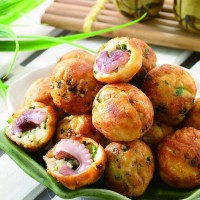③油炸糖糕做法:配方:高筋面粉1000克、白糖200克(夾心帶餡糖糕不加白糖)、泡多源Q型20-30克、開水1800克。工藝:1.將泡多源、白糖(夾心帶餡糖糕不加白糖)與干面粉拌勻,然后淋入熱水,一邊加熱水一邊用搟面杖由慢至快攪拌,攪數十圈至面團粘稠,且看上去有一層一層的感覺時,即可。2.制作糖糕的方法通常有兩種。一是將加了糖的燙面團,根據需要制成50~100克不等的小劑,分別在每個劑子表面抹一層油后,或拍成厚1.5厘米、直徑約3厘米的圓餅,或是將抹有油的面劑制成橢圓形的餅,入油鍋炸制。二是燙面時未加糖的燙面團,則要包入餡心(如紅糖、豆沙、果醬、蓮蓉等),在包制時,注意不要把餡心沾到糖糕表面,否則炸制時會出現黑斑點。3.炸制糖糕的方法先把炸鍋置火上,燒熱后注入半鍋油,待油溫燒至五成熱時,逐個下入糖糕生坯。下鍋后,切忌用勺推動糖糕生坯,以免糖糕坯相互擠壓變形,不過可以用快速晃鍋的方法使糖糕不粘連且不接觸鍋底。待糖糕浮起時,可以離火(或將火調成最?。┰佟敖闭?分鐘,撈出瀝油。注意:“僵炸”是炸制糖糕的技術關鍵。如果長時間用大火或中火炸制,糖糕會出現外熟內生(俗稱“溏心”)現象,甚至會因內部空氣膨脹,使糖糕爆裂。另外,若是沒采用“僵炸”的方法,那炸成的糖糕會干癟無光,有如“死”餅。