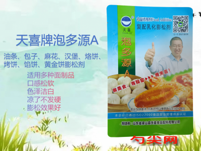 ★天喜牌泡多源A型 產品名稱:泡多源牌復配乳化膨松劑 型號:PDY-A 本品按照《食品安全國家標準 食品添加劑使用標準GB2760》及補充規定的品種、應用分類、使用范圍、最大使用量、殘留量等科學組方,并且按照《食品安全國家標準 復配食品添加劑通則GB26687》精心配制而成。本品已經通過食品生產許可,保障食品安全。用戶按照本說明的用法用量生產制作的發酵面制品(食品分類號:06.03.02.03)、面糊、裹粉、煎炸粉(食品分類號:06.03.02.04)、油炸面制品(食品分類號:06.03.02.05)、焙烤食品(食品分類號:07.0)既不會超標也不會超量。