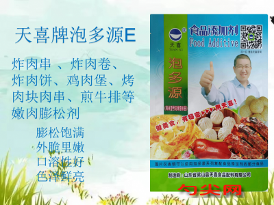 ★商品名:天喜牌泡多源E型 產品名稱:泡多源牌復配酶制膨松劑1 型號:PDY-E 本品按照《食品安全國家標準 食品添加劑使用標準GB2760》及補充規定的品種、應用分類、使用范圍、最大使用量、殘留量等科學組方,并且按照《食品安全國家標準 復配食品添加劑通則GB266871》精心配制而成。本品已經通過食品生產許可,保障食品安全。用戶按照本說明的用法用量生產制作的熟制肉制品(食品分類號:08.03)、預制肉制品(食品分類號:08.02)、冷凍魚糜制品(食品分類號:09.02.03)既不會超標也不會超量。