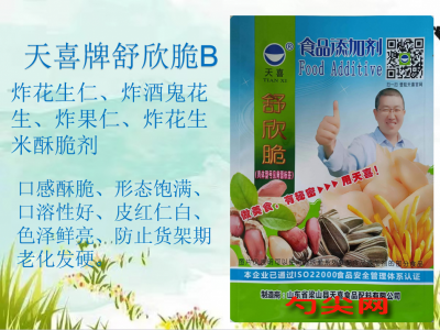 ★商品名:天喜牌舒欣脆B型 產品名稱:舒欣脆牌復配穩定膨松劑1 型號:SXC-B 本品完全按照《食品安全國家標準 食品添加劑使用標準GB2760》及補充規定的品種、應用分類、使用范圍、最大使用量、殘留量等科學組方,并且按照《食品安全國家標準 復配食品添加劑通則GB26687》精心配制而成。本品已經通過食品生產許可,保障食品安全。用戶按照本說明的用法用量生產制作的 面糊(如用于魚和禽肉的拖面糊)、裹粉、煎炸粉(食品分類號:06.03.02.04)、膨化食品(食品分類號:16.06)、熟制堅果與籽類(僅限油炸堅果與籽類)(食品分類 號:04.05.02.01)既不會超標也不會超量。