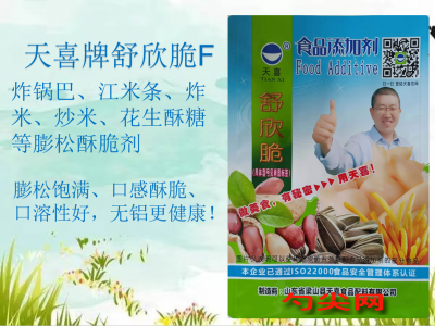 ★商品名:天喜牌舒欣脆F型 產(chǎn)品名稱:舒欣脆牌復(fù)配酶制膨松劑 型號(hào):SXC-F 本品完全按照《食品安全國(guó)家標(biāo)準(zhǔn) 食品添加劑使用標(biāo)準(zhǔn)GB2760》及補(bǔ)充規(guī)定的品種、應(yīng)用分類、使用范圍、最大使用量、殘留量等科學(xué)組方,并且按照《食品安全國(guó)家標(biāo)準(zhǔn) 復(fù)配食品添加劑通則GB26687》精心配制而成。本品已經(jīng)通過(guò)食品生產(chǎn)許可,保障食品安全。用戶按照本說(shuō)明的用法用量生產(chǎn)制作的各類食品(配料表中成分在GB2760表A.1中有限量要求的食品 除外;配料表中成分在GB2760表A.3中所例外的食品除外)既不會(huì)超標(biāo)也不會(huì)超量。