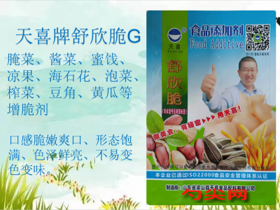 ★商品名:天喜牌舒欣脆G型 產品名稱:舒欣脆牌復配抗氧化膨松酸度調節劑 型號:SXC-G 本品完全按照《食品安全國家標準 食品添加劑使用標準GB2760》及補充規定的品種、應用分類、使用范圍、最大使用量、殘留量等科學組方,并且按照《食品安全國家標準 復配食品添加劑通則GB26687》精心配制而成。本品已經通過食品生產許可,保障食品安全。用戶按照本說明的用法用量生產制作的 各類食品(配料表中成分在GB2760表A.1中有限量要求的食品 除外;配料表中成分在GB2760表A.3中所例外的食品除外)既不會超標也不會超量。