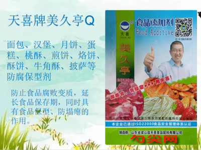 ★商品名:天喜牌美久亭Q 產品名稱:美久亭牌復配防腐劑8 型號:MJT-Q 本品按照《食品安全國家標準 食品添加劑使用標準GB2760》及補充規定的品種、應用分類、使用范圍、最大使用量、殘留量等科學組方,并且按照《食品安全國家標準 復配食品添加劑通則GB26687》精心配制而成。本品已經通過食品生產許可,保障食品安全。用戶按照本說明的用法用量生產制作的面包(食品分類號:07.01)、糕點(食品分類號:07.02)既不會超標也不會超量。