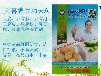 ★商品名:天喜牌豆功夫A型 產品名稱:豆功夫牌復配豆類制品凝固劑 型號:DGF-A 本品按照《食品安全國家標準 食品添加劑使用標準GB2760》及補充規(guī)定的品種、應用分類、使用范圍、最大使用量、殘留量等科學組方,并且按照《食品安全國家標準 復配食品添加劑通則GB26687》精心配制而成。本品已經通過食品生產許可,保障食品安全。用戶按照本說明的用法用量生產制作的豆類制品(食品分類號:04.04)既不會超標也不會超量。