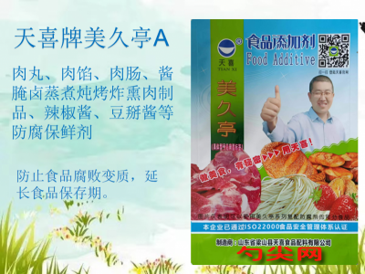 ★商品名:天喜牌美久亭A 產品名稱:美久亭牌復配防腐劑1 型號:MJT-A 本品按照《食品安全國家標準 食品添加劑使用標準GB2760》及補充規定的品種、應用分類、使用范圍、最大使用量、殘留量等科學組方,并且按照《食品安全國家標準 復配食品添加劑通則GB26687》精心配制而成。本品已經通過食品生產許可,保障食品安全。用戶按照本說明的用法用量生產制作的熟肉制品(08.03.08肉罐頭類除外)(食品分類號:08.03)、復合調味料(食品分類號:12.10)既不會超標也不會超量。