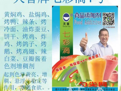 ★功能作用:〔七彩滴1型〕用于黃燜雞、鹽焗雞、烤鴨、辣條、烤冷面、油炸蠶豆、餅干、烤雞、炸雞、烤鴿子、烤鵝、烤雞翅、辣白菜、豆瓣醬、燒烤撒粉、炸雞架、鐵板燒鴨等食品,起到色澤黃亮、增稠、懸浮、穩(wěn)定等作用,增強食欲。〔七彩滴1型〕使用色素為天然提取物,放心使用。〔七彩滴1型〕還可用于無磷烤雞翅、無磷鹵雞爪、烤雞皮等。