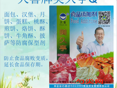 ★商品名:天喜牌美久亭Q 產品名稱:美久亭牌復配防腐劑8 型號:MJT-Q 本品按照《食品安全國家標準 食品添加劑使用標準GB2760》及補充規定的品種、應用分類、使用范圍、最大使用量、殘留量等科學組方,并且按照《食品安全國家標準 復配食品添加劑通則GB26687》精心配制而成。本品已經通過食品生產許可,保障食品安全。用戶按照本說明的用法用量生產制作的面包(食品分類號:07.01)、糕點(食品分類號:07.02)既不會超標也不會超量。