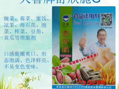 ★功能作用:采用本品加工制作的水果制品(蜜餞、果脯),腌漬竹筍、醬菜、腌菜、泡菜、榨菜、豆角、黃瓜、蘿卜等蔬菜制品,食用菌制品(腌漬木耳、金針菇)、藻類制品(腌漬海石花)等口感脆嫩爽口、形態(tài)飽滿、色澤鮮亮、不易變色變味。本品用于冷凍腌制肉制品和水產(chǎn)品可以起到保型及防止粘連的作用。本品用于涼糕凝固保型,還可以增加硬度。本品用于鍋貼可以增加酥脆口感,保持形狀。